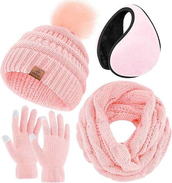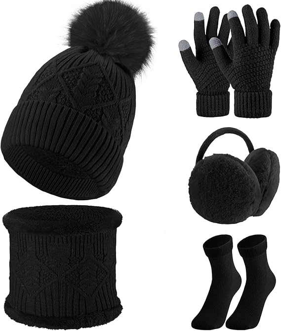 5 Pcs Winter Hat Scarf Gloves Set Fleece Lined Knit Beanie Hat Warm Touch Screen Gloves Earmuff Warmer for Women