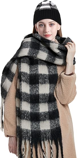 Large Chunky Plaid Scarf & Beanie Hat Set Winter Colorful Oversized Scarf Hat for Women
