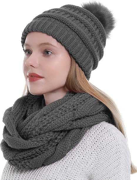 Winter Scarf and Hat Set for Women Thick Cable Knitted Circle Loop Infinity Scarfs and Warm Beanie Hat