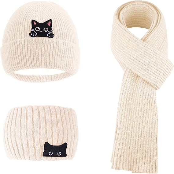 Women Winter Warm Knit Beanie Cat Hat,Cat Headband and Scarf Set, Cat Lover Gifts For Women, Cat Themed Gifts