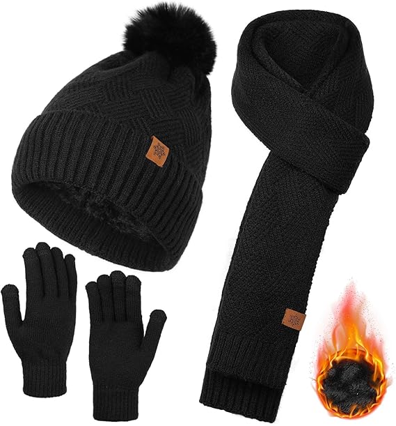 Womens Beanie Hat Scarf Gloves Set, Fleece Lined Warm Winter Hat with Pom Pom, Long Knit Scarf 3 in 1 Set for Cold Weather