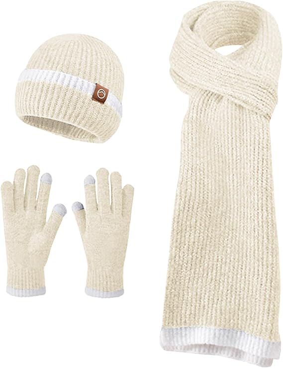 Winter Beanie Hat Scarf Gloves Set, Thick Warm Knit Winter Skull Cap Touch Screen Gloves Neck Scarf for Women Men