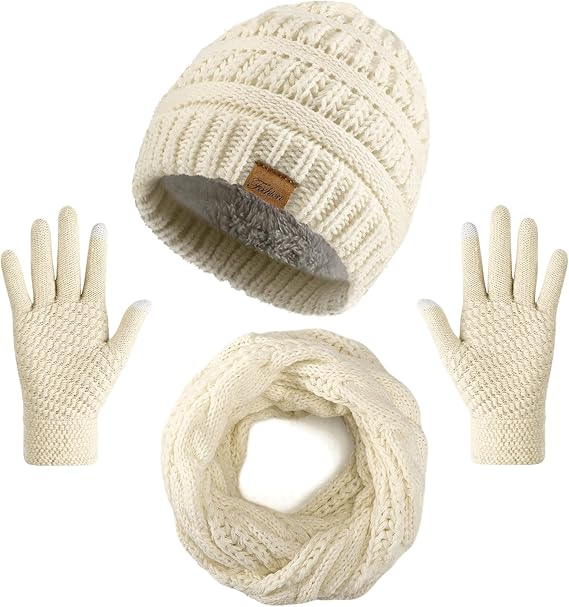 Beanie Hats for Women Beanie Hats Scarf Touchscreen Gloves Set Warm Knit Thick Fleece Lined Skull Cap Gifts for Women