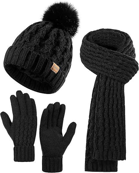 Women Winter Beanie Hat Scarf Gloves Set Pom Hat with Warm Fleece Lined Long Knit Scarf Touchscreen Gloves for Cold Weather