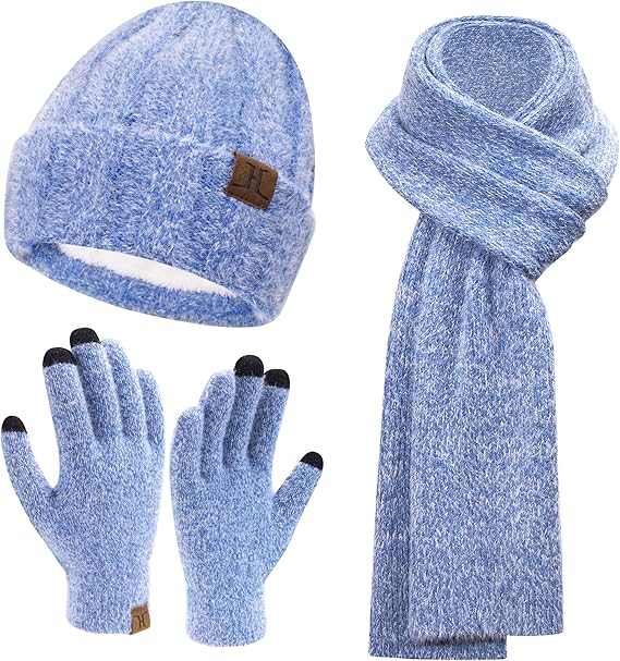 Womens Winter Warm Knit Beanie Hat Touchscreen Gloves Long Neck Scarf Set with Fleece Lined Skull Caps Gifts for Women Blue