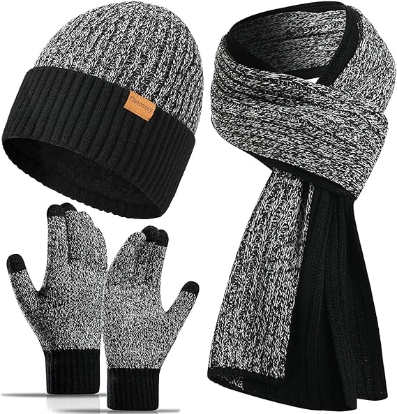 Men's Winter Hat Scarf Gloves Set, 3 PCS Warm Beanie Long Scarf fleece lined Touchscreen Gloves for Cold Weather